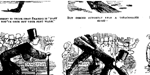These 19 panels were published as three installments in Punch. Nine years later Busch created his famous 'Eispeter' (Peter falls into the same type of hole in the ice and turns into an iceblock). As Busch had already copied Cruikshank's toothache, he possibly found some inspiration in this story as well.
